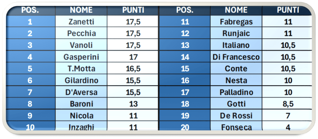 Aggiornamenti Premio “Corto Muso”. La classifica vede Zanetti evitare la tagliola dei punti malus e mantenere il primato, in compagnia dei sapienti Pecchia e Vanoli. Sul podio, sornioni, Gasp e Motta attendono in surplace. Per De Rossi e Fonseca è invece notte fonda. entrambi sono attesi da scontri ad alta quota con Motta e Baroni. Due ganci in mezzo al cielo oppure sotto il mento? Lo scopriremo solo vivendo…