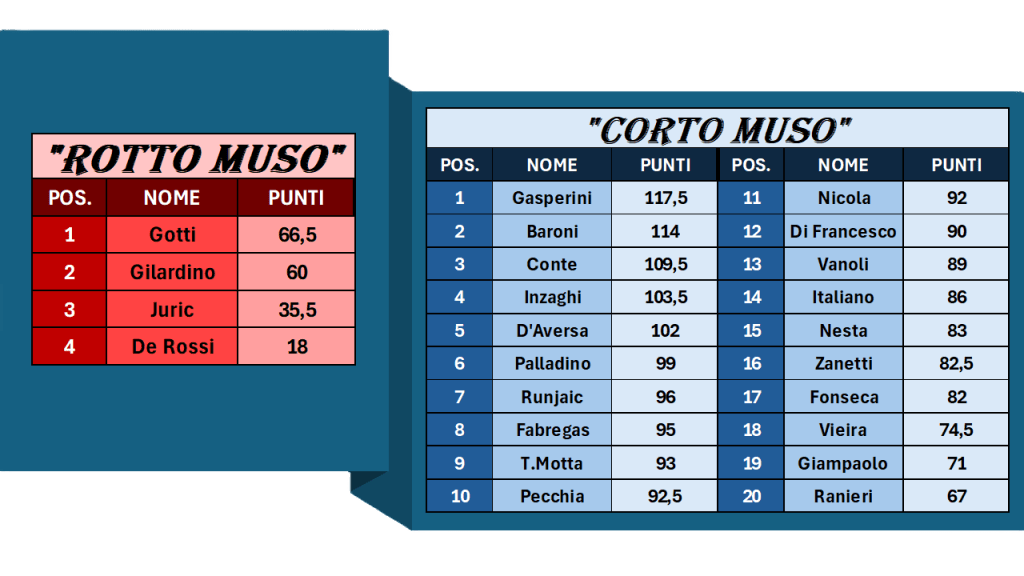 Ci sono grosse novità riguardo la classifica e la nascita di una nuova graduatoria. La motivazione è presto spiegata: i presidenti italiani, dei veri mangiafuoco, hanno già esonerato Gotti, Gilardino, De Rossi e Juric. Non possono poi stare sereni i vari Zanetti, Nesta, Di Francesco…